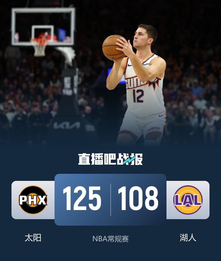 比赛开始,双方上来打得都有些紧,东契奇再次杀红眼,里突外投单节轰下20分,而布克联手狄龙能给出回应,首节双方战成33平,次节太阳3分钟仅拿2分,但狄龙站出来带队7-0反超比分,布克伤退后狄龙各种中远投单节砍下15分带领太阳半场领先到14分。下半场,艾顿接连内线止血,东契奇连续外线发炮追分,但狄龙依然状态火热,连续中远投不仅回应还带队领先到20分以上,末节詹姆斯攻传带队追分,但吉莱斯皮连续4记三分打花比赛,双方替补练兵,最终太阳125-108轻取湖人,终结对手7连胜。